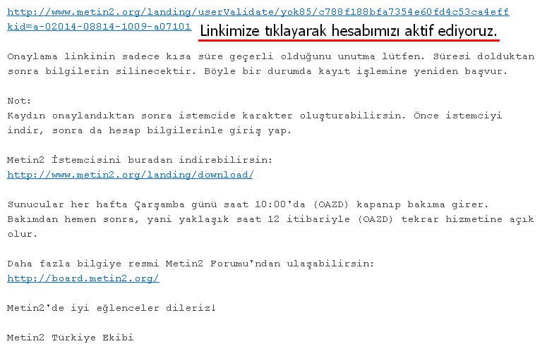 Aşağıdaki resimde görüldüğü üzere gelen linkimize tıklıyoruz ve metin2 hesabımızı aktif etmiş oluyoruz.